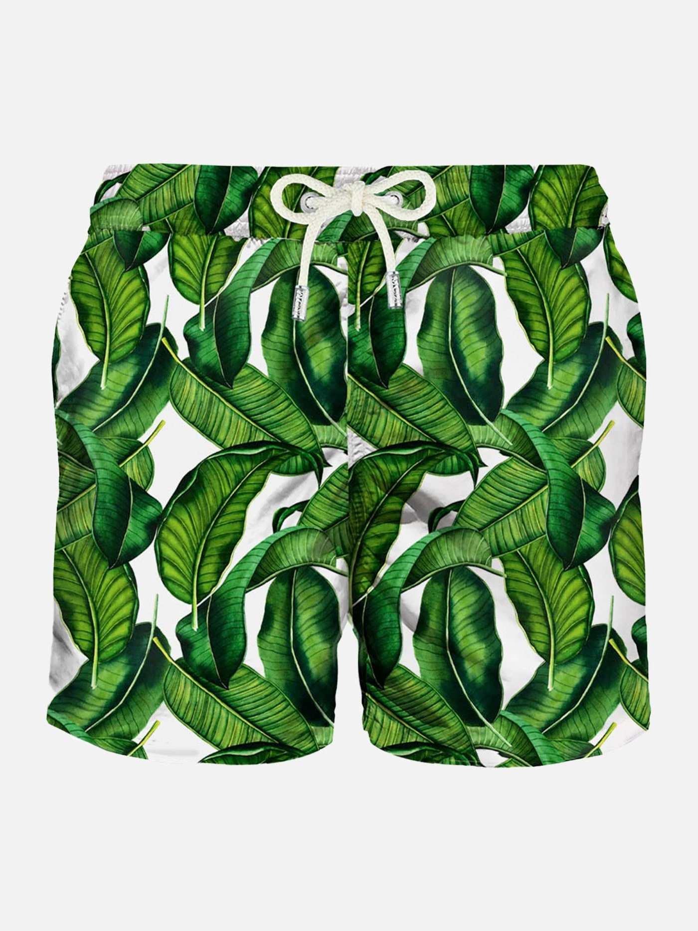 Banana Leaves all over print, Swim Short mid-lenght, regular fit, with white microfiber, comfortable drawstring waist, inside ergonomic brief, pockets on both sides, backside classic pocket with velcro closure.