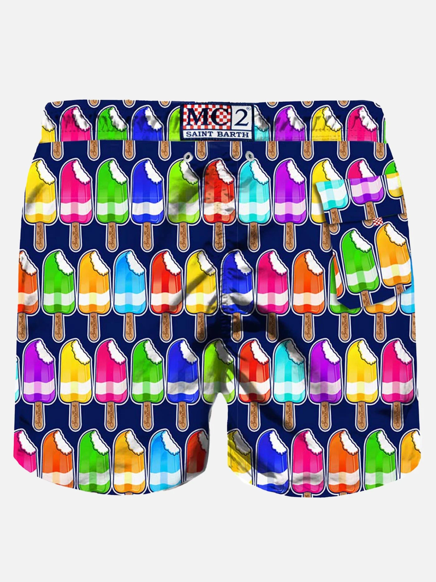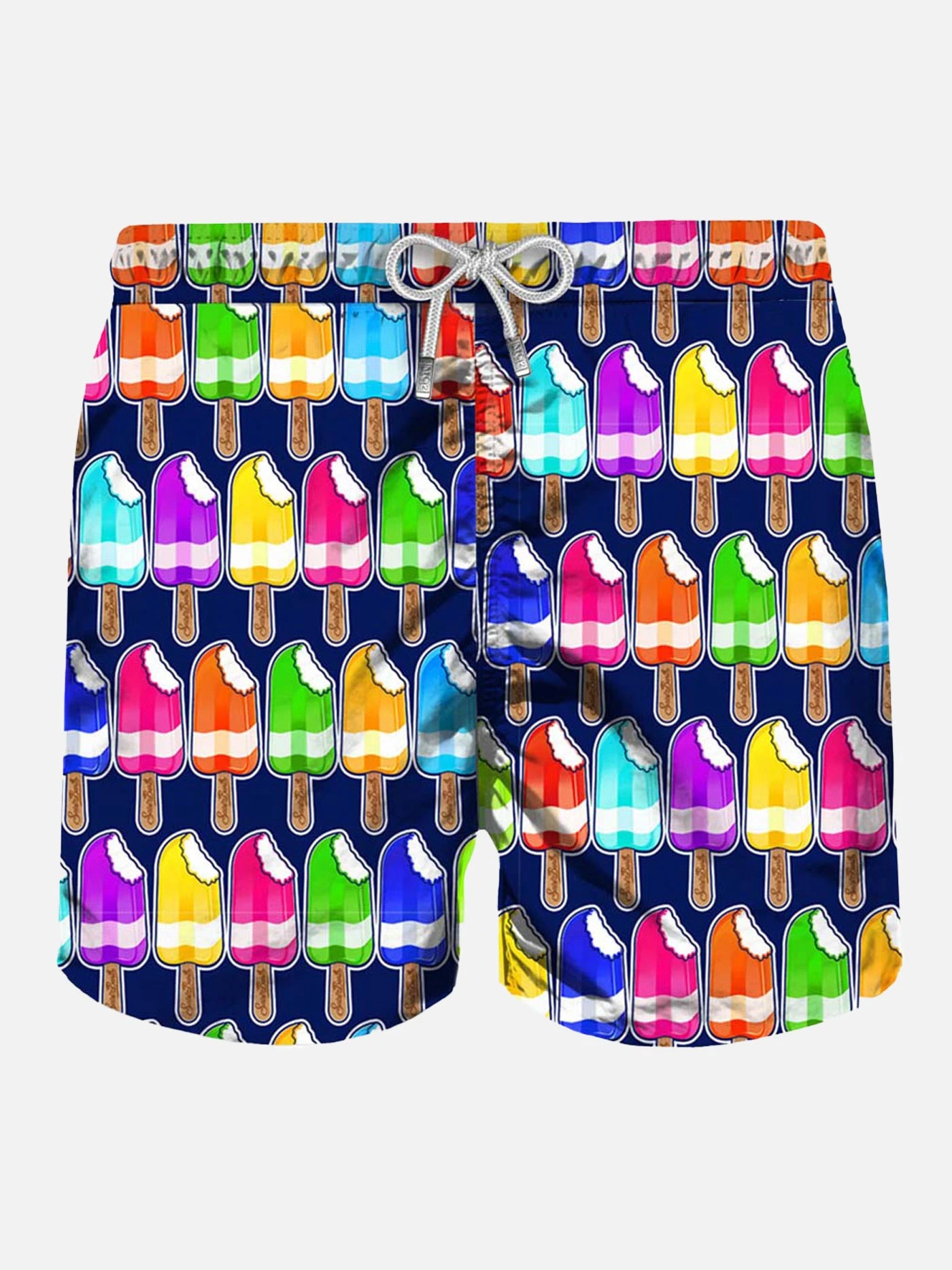 Colored Ice Cream all over print, Swim Short mid-lenght, regular fit, blue navy microfiber, comfortable drawstring waist, inside ergonomic brief, drawcord closure, backside classic pocket with velcro closure.