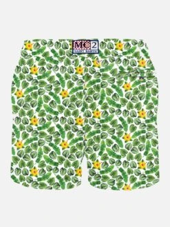boy classic swim shorts, military green camouflage print light fabric, side band in contrasting colors,