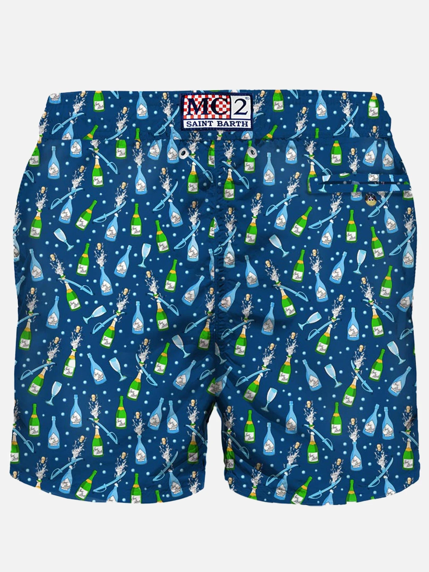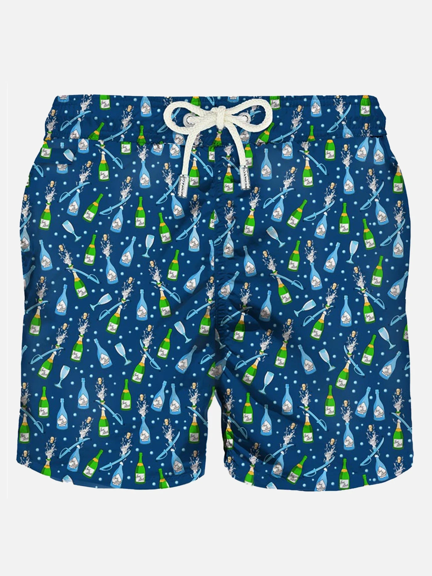 Man’s classic swim short, mini bottles print, light fabric, quick drying, mid-lenght, light net lining, elasticated waistband, drawstring fastening, front and back pocket with button.