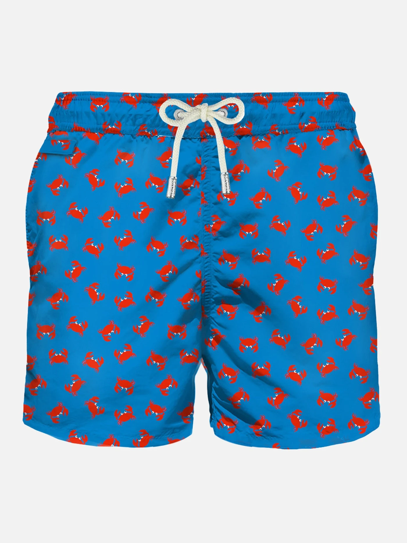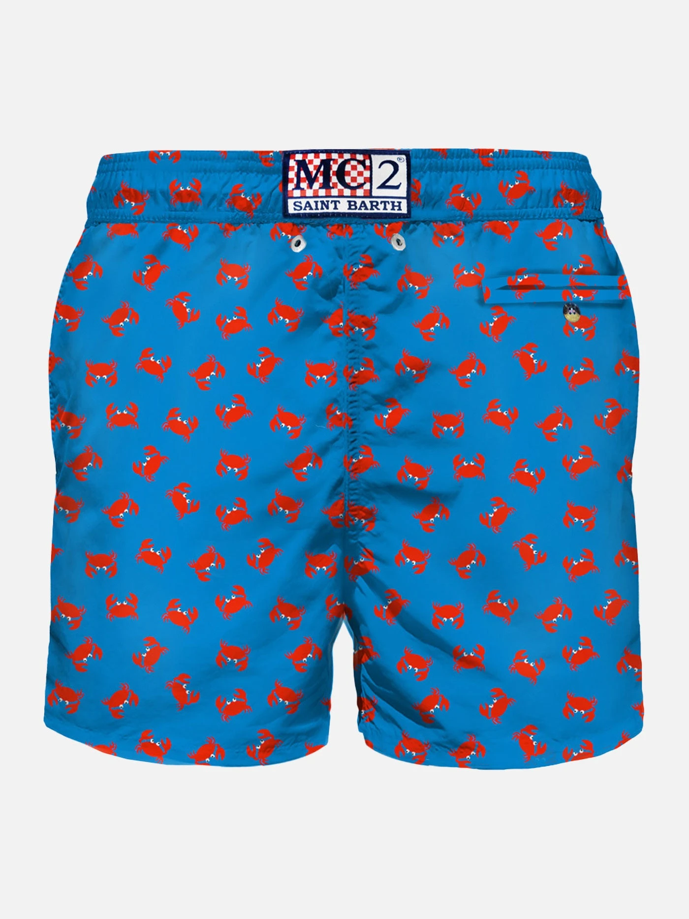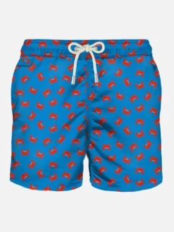 MC2 Saint Barth man’s classic swim short, red micro crabs all over print on bluette backcloth, light fabric, quick drying, mid-lenght, light net lining, elasticated waistband, drawstring fastening, front and back pocket with button.