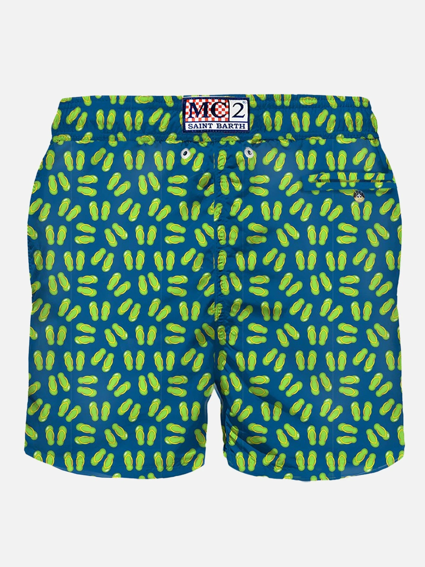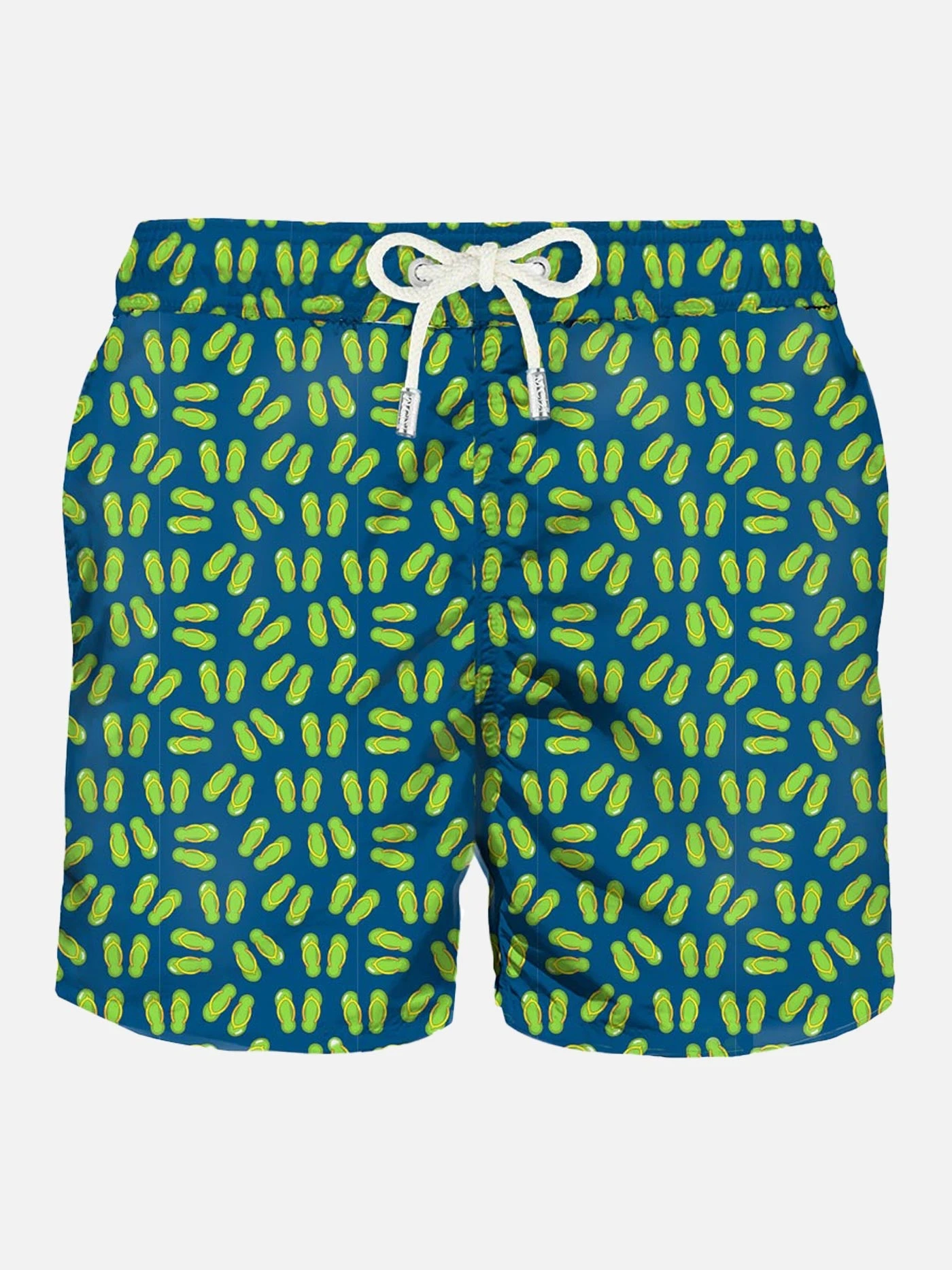 Man’s classic blue Ā swim short, miniĀ flip flop Ā print, light fabric, quick drying, mid-lenght, light net lining, elasticated waistband, drawstring fastening, front and back pocket with button.
