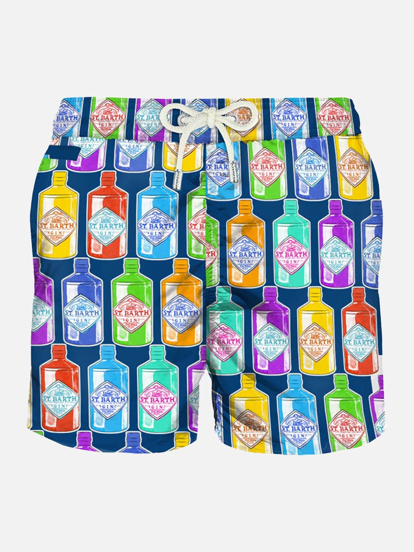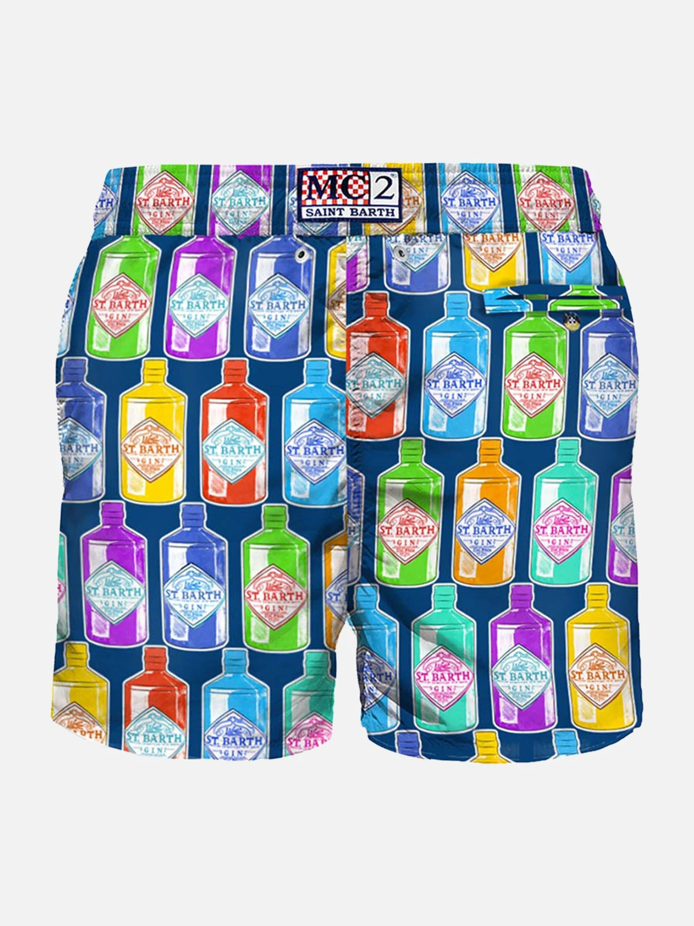 MC2 Saint Barth man’s classic swim shorts, multicolor gin bottles all over print on blue backcloth, light fabric, quick drying, mid-length, light net lining, elasticated waistband, drawstring fastening, front and back pocket with button.