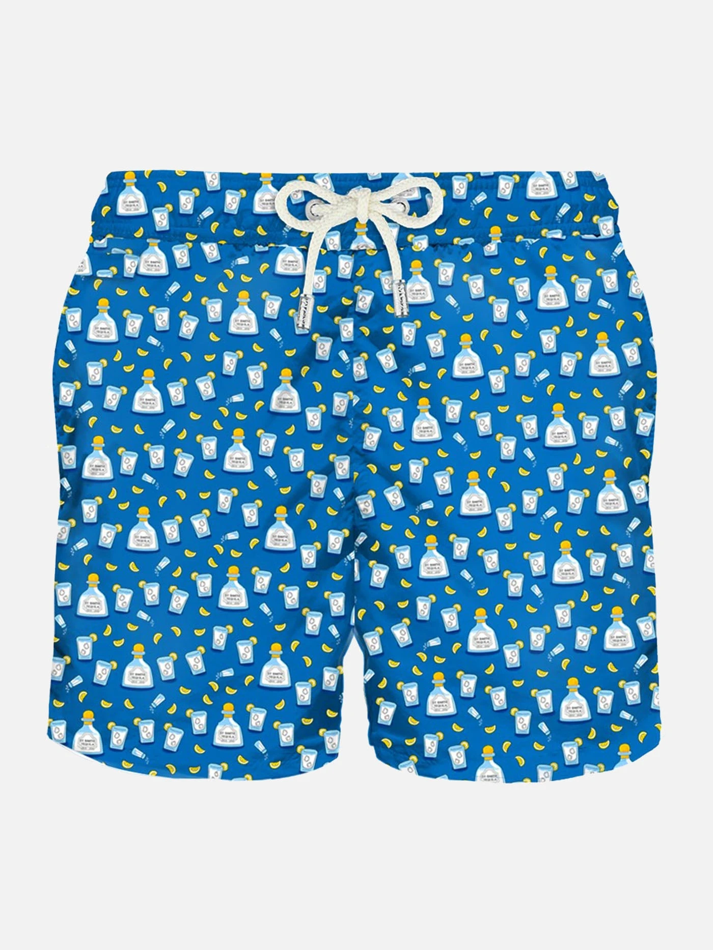 Man’s classic swim short,bluetteĀ miniĀ Tequila print, light fabric, quick drying, mid-lenght, light net lining, elasticated waistband, drawstring fastening, front and back pocket with button.