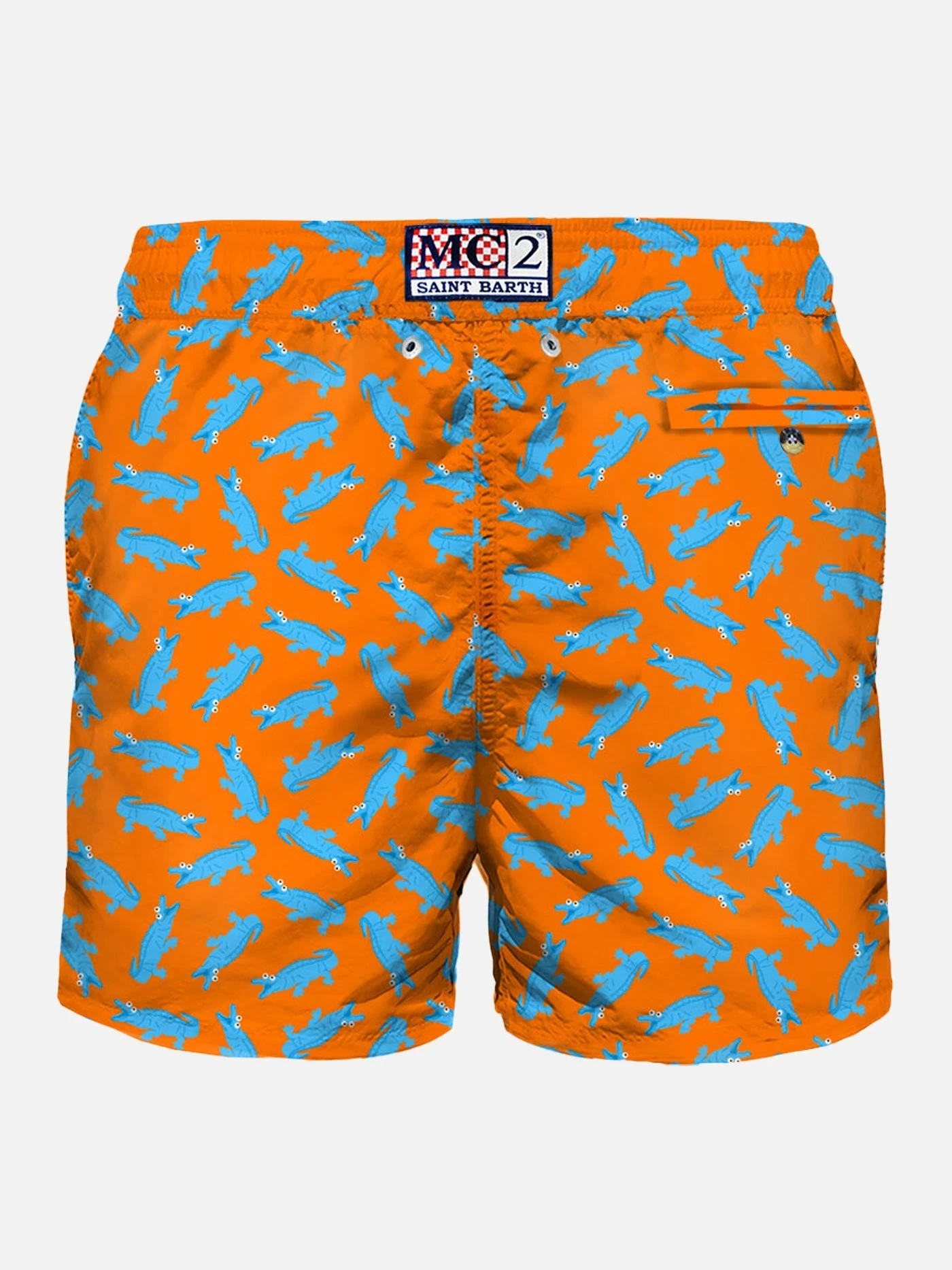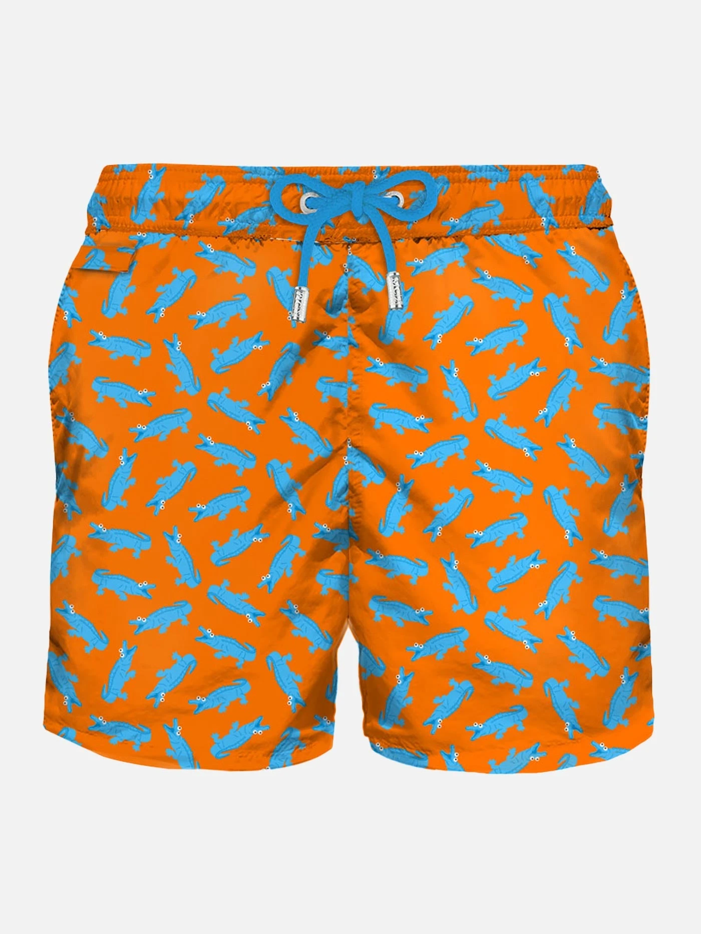 Man’s classic swim short orange , mini crocodile print, light fabric, quick drying, mid-lenght, light net lining, elasticated waistband, drawstring fastening, front and back pocket with button.