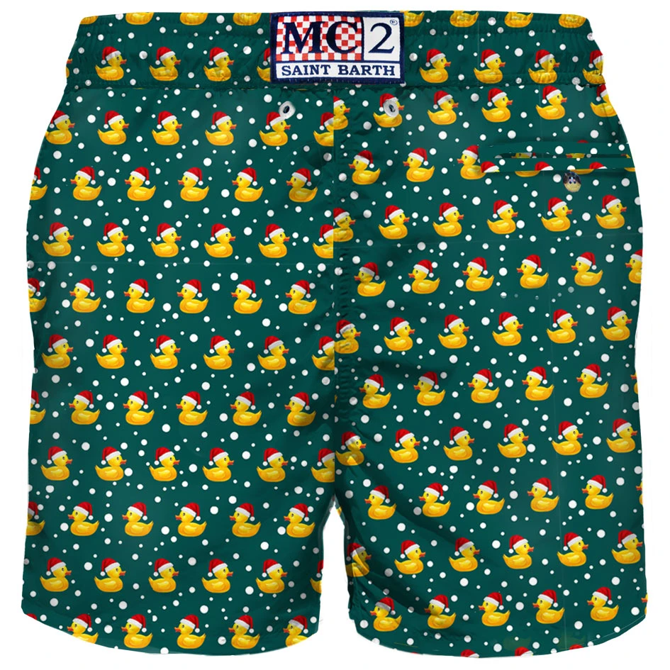 Man’s swim trunks in light fabric with MC2 Saint Barth iconic ducky under the snow, dark green background, quick dry fabric, regular fit, inside ergonomic brief, drawcord closure, backside pocket with velcro closure, pockets on both sides.