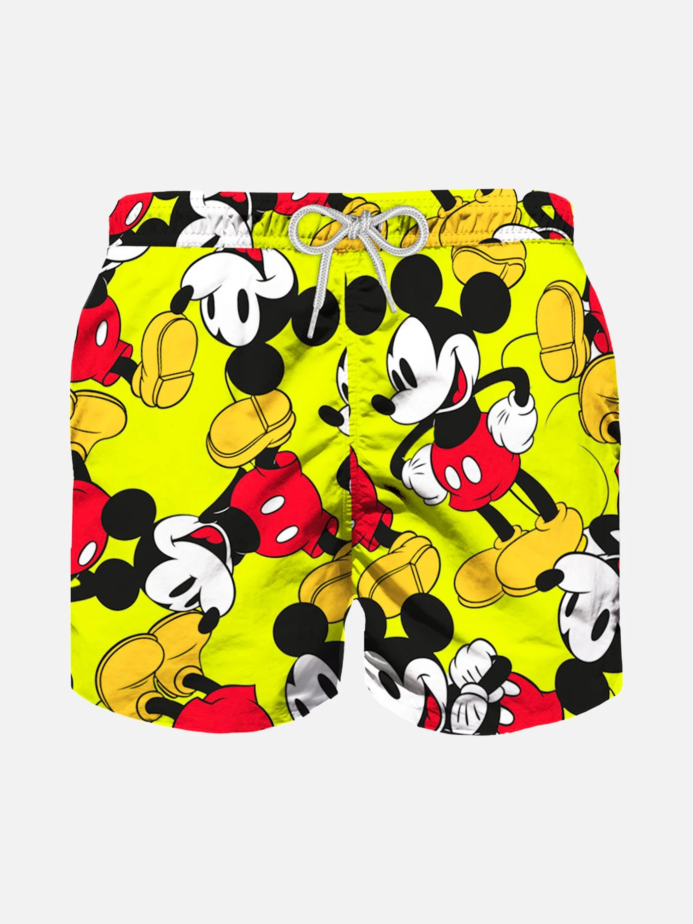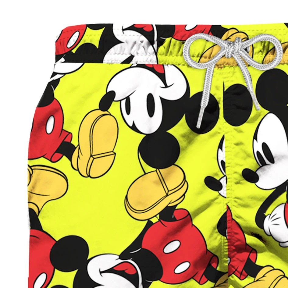 Boys’ Swimshorts, mid-length, Mickey Mouse all over print on yellow fluo backcloth, regular fit, comfortable drawstring waist, inside ergonomic brief, drawcord closure, pockets on both sides, backside classic pocket with velcro closure. Disney© Special Edition.