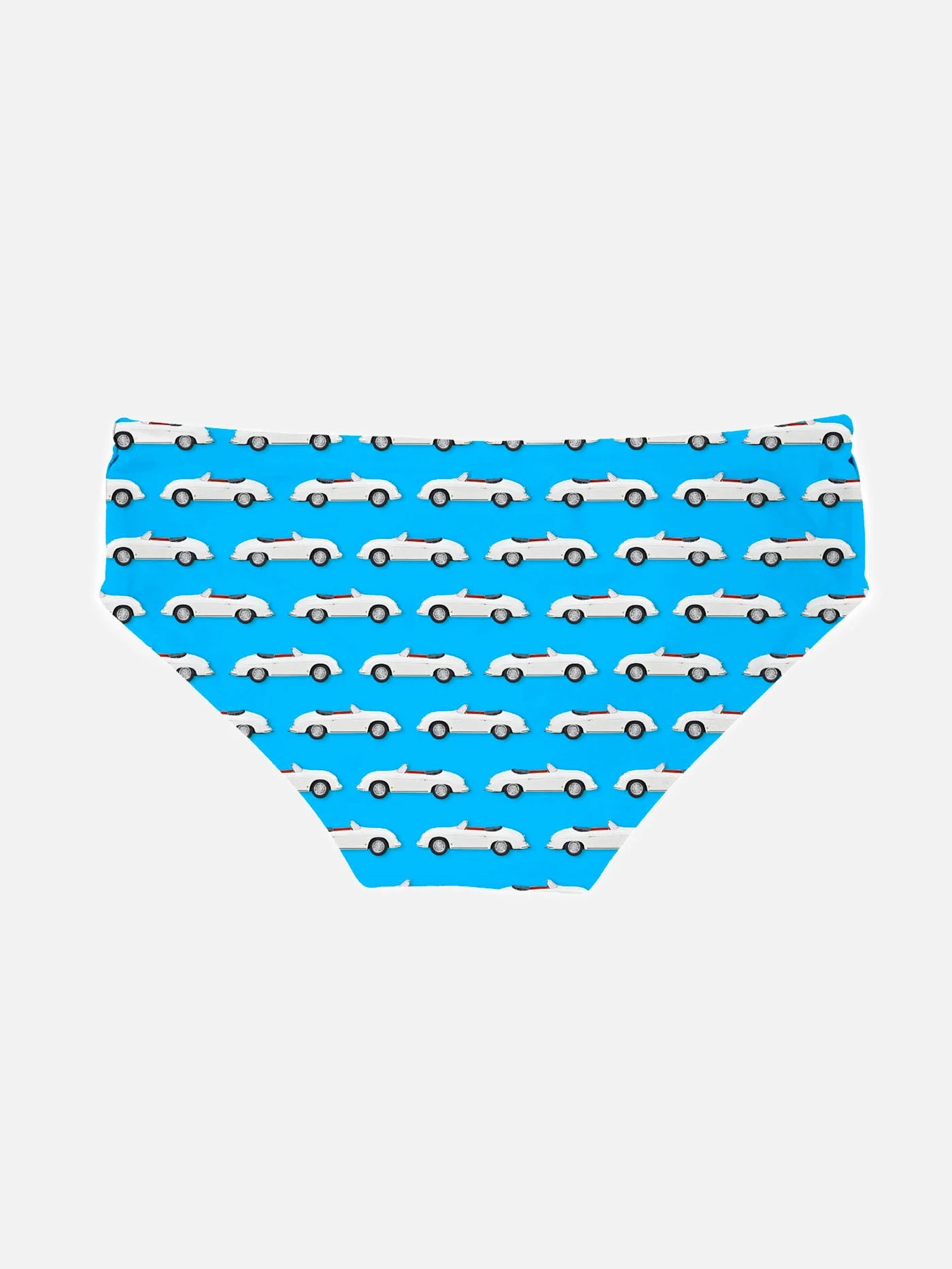 Boys Swim Brief, white cars all over print, light blue lycra fabric, elasticated waistband and interior drawstring, MC2 brand logo stitched on front at lateral side, Inside lining.