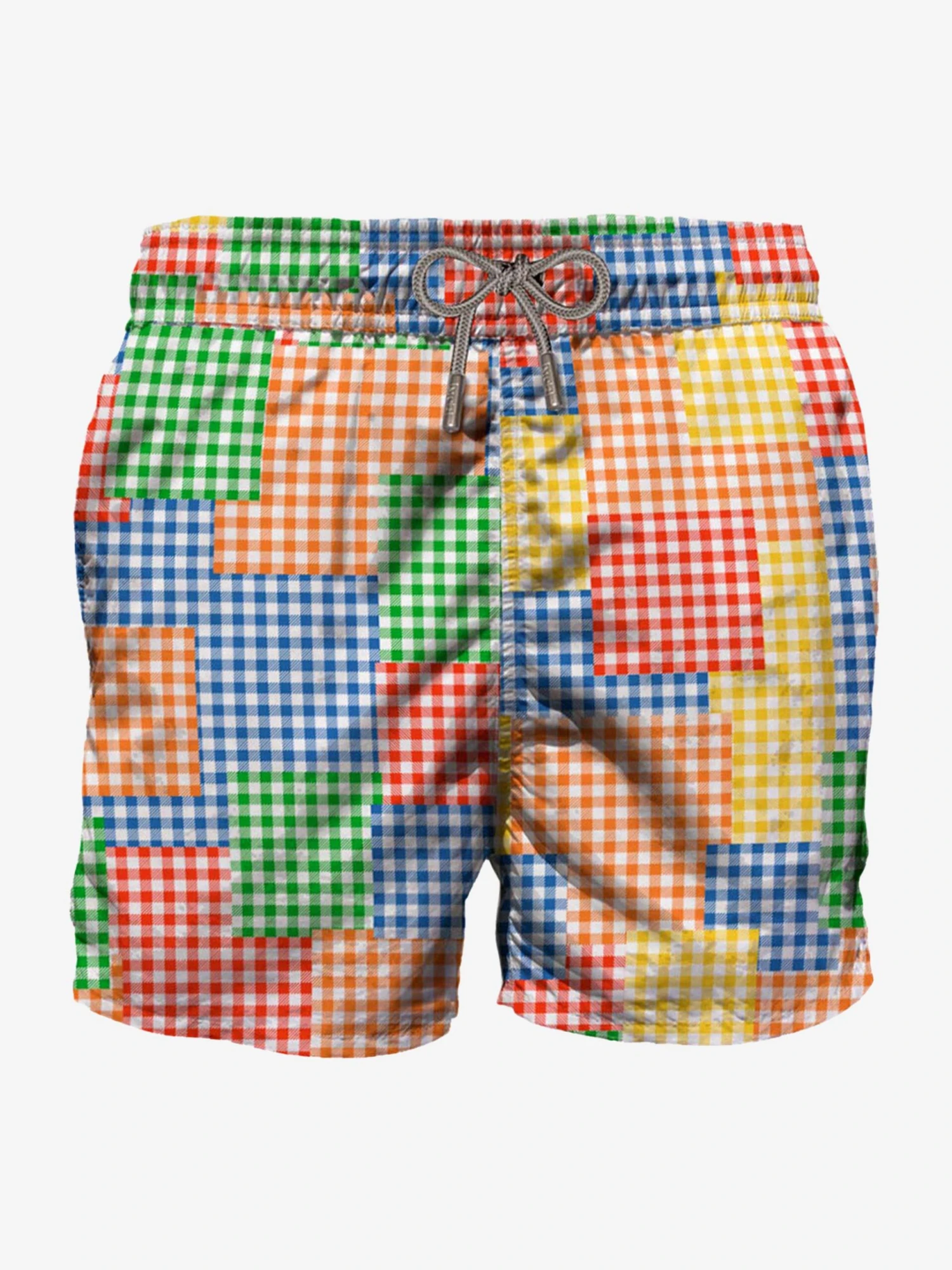 Mens Swim Shorts mid-lenght,vichy patches, regular fit, microfiber, inside ergonomic brief, pockets on both sides, drawcord closure, backside classic pocket with velcro closure.