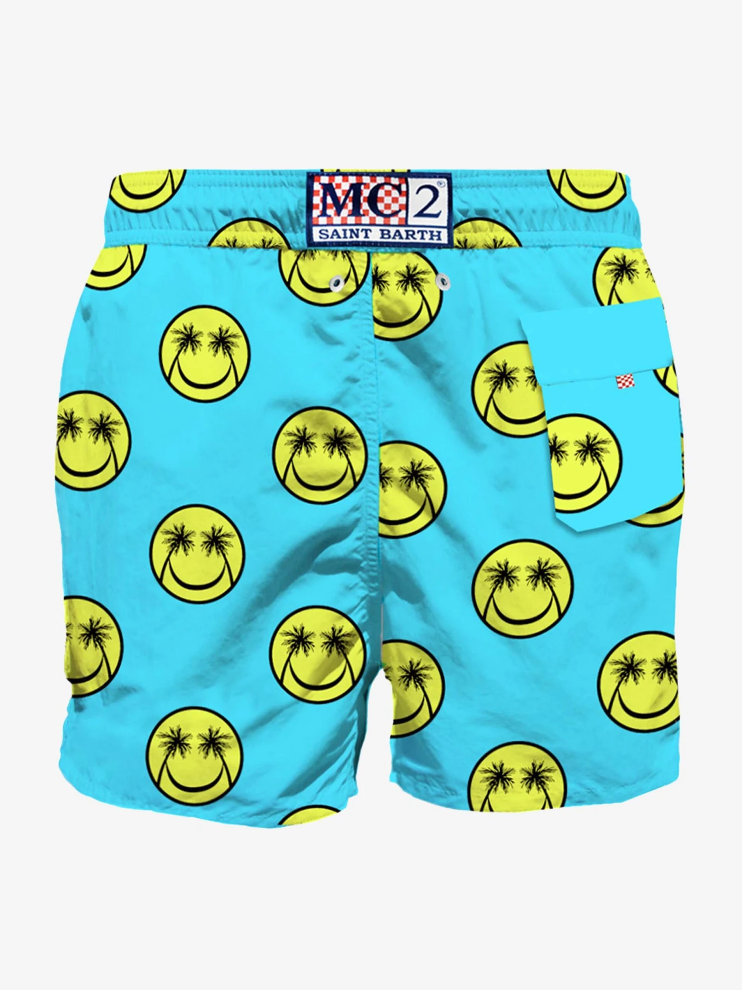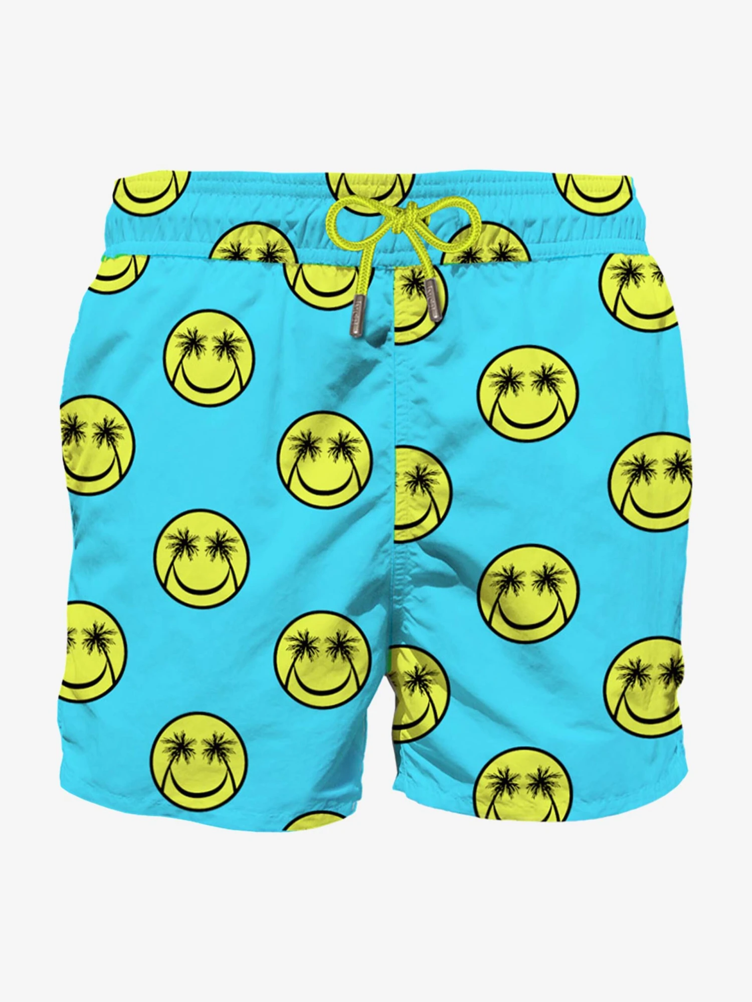 Mens Swim Shorts mid-lenght, torquoise with palm smile print, regular fit, microfiber, inside ergonomic brief, pockets on both sides, drawcord closure, backside classic pocket with velcro closure.