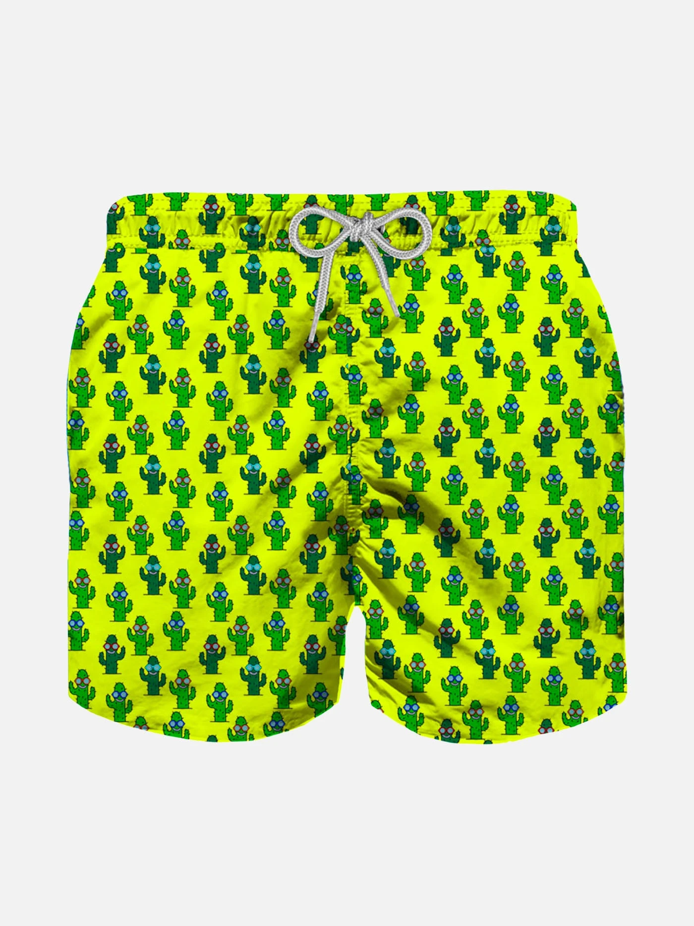 Boys’ Swim Trunks, mid lenght, micro cactus all over print, regular fit, yellow fluo backcloth, comfortable drawstring waist, inside ergonomic brief, drawcord closure, pockets on both sides, backside classic pocket with velcro closure.