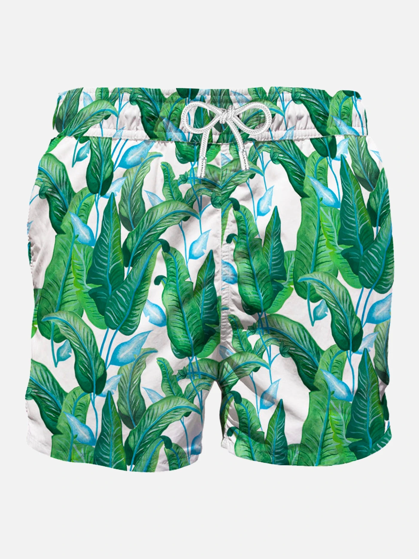 Green tropical leaf all over print, Swim Trunk mid-lenght, regular fit, white microfiber, comfortable drawstring waist, inside ergonomic brief, drawcord closure, backside classic pocket with velcro closure.