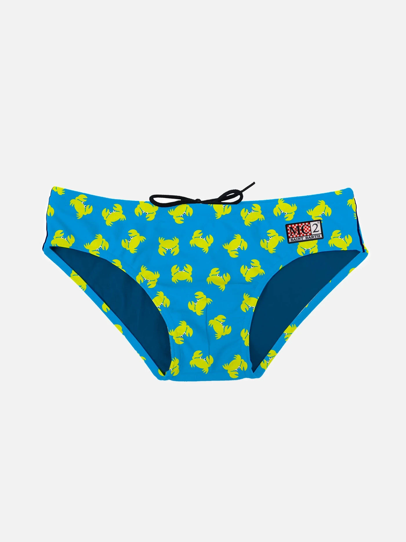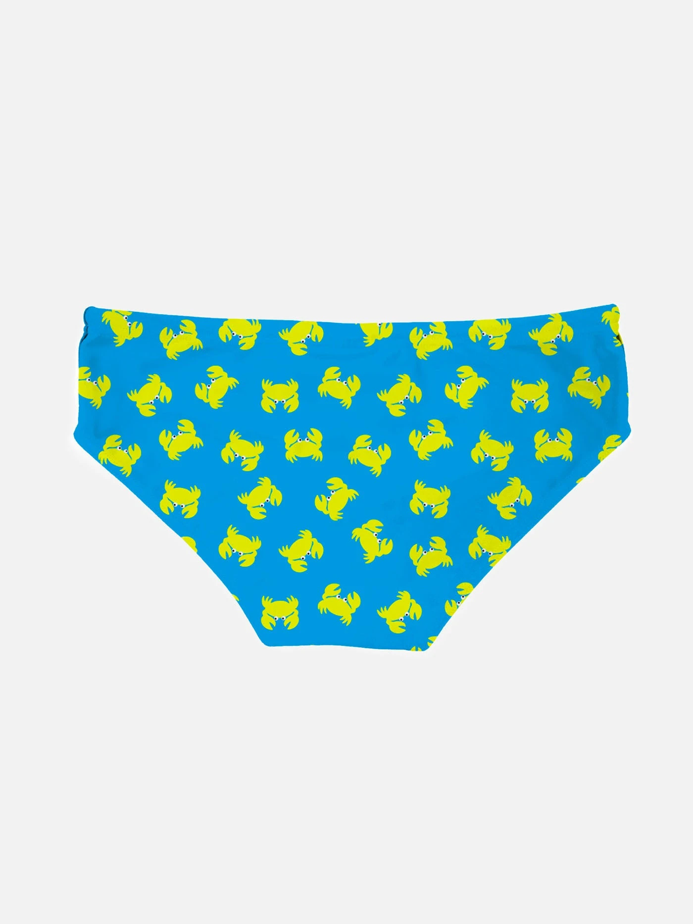 Light blue boys Swim Briefs, yellow fluo micro crabs all over print, light blue lycra fabric, elasticated waistband and interior drawstring, MC2 brand logo stitched at lateral side, Inside lining. Composition: %83 Polyester, 17% Elastane