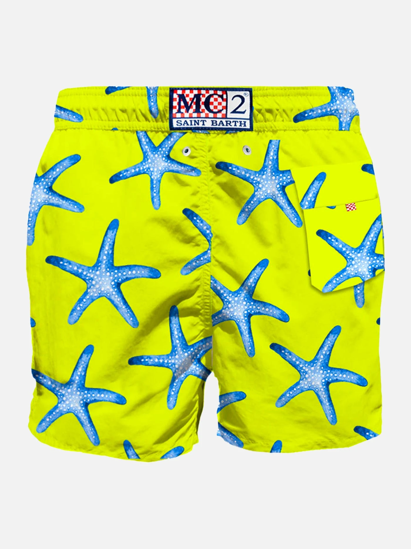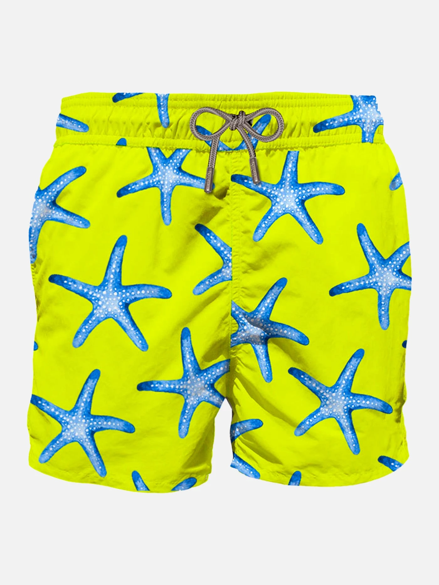 Mens Swim Shorts mid-lenght, yellow with stars print , regular fit, microfiber, inside ergonomic brief, pockets on both sides, drawcord closure, backside classic pocket with velcro closure.